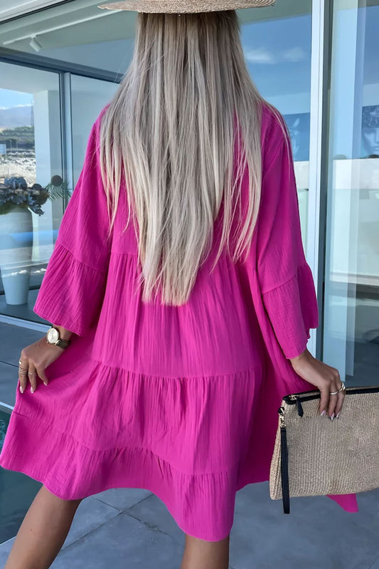 Rose Crinkled Tiered Split Neck Shirt Dress