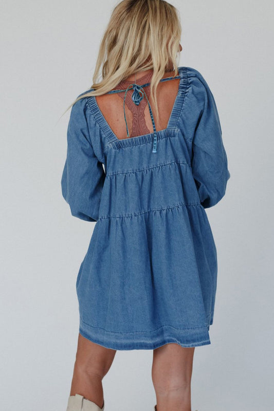 Dusk Blue Square Neck Side Pockets Loose Fit Denim Mini Dress