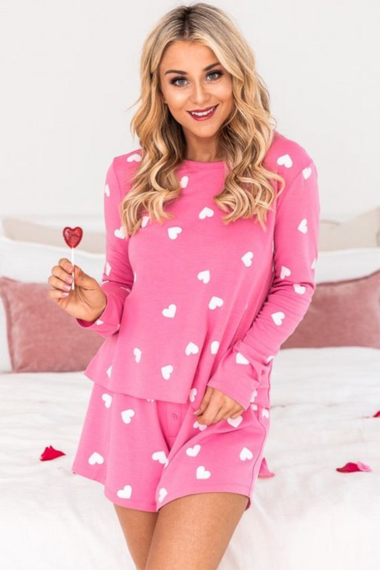 Pink Valentine Heart Print Long Sleeve Top and Shorts Pajama Set