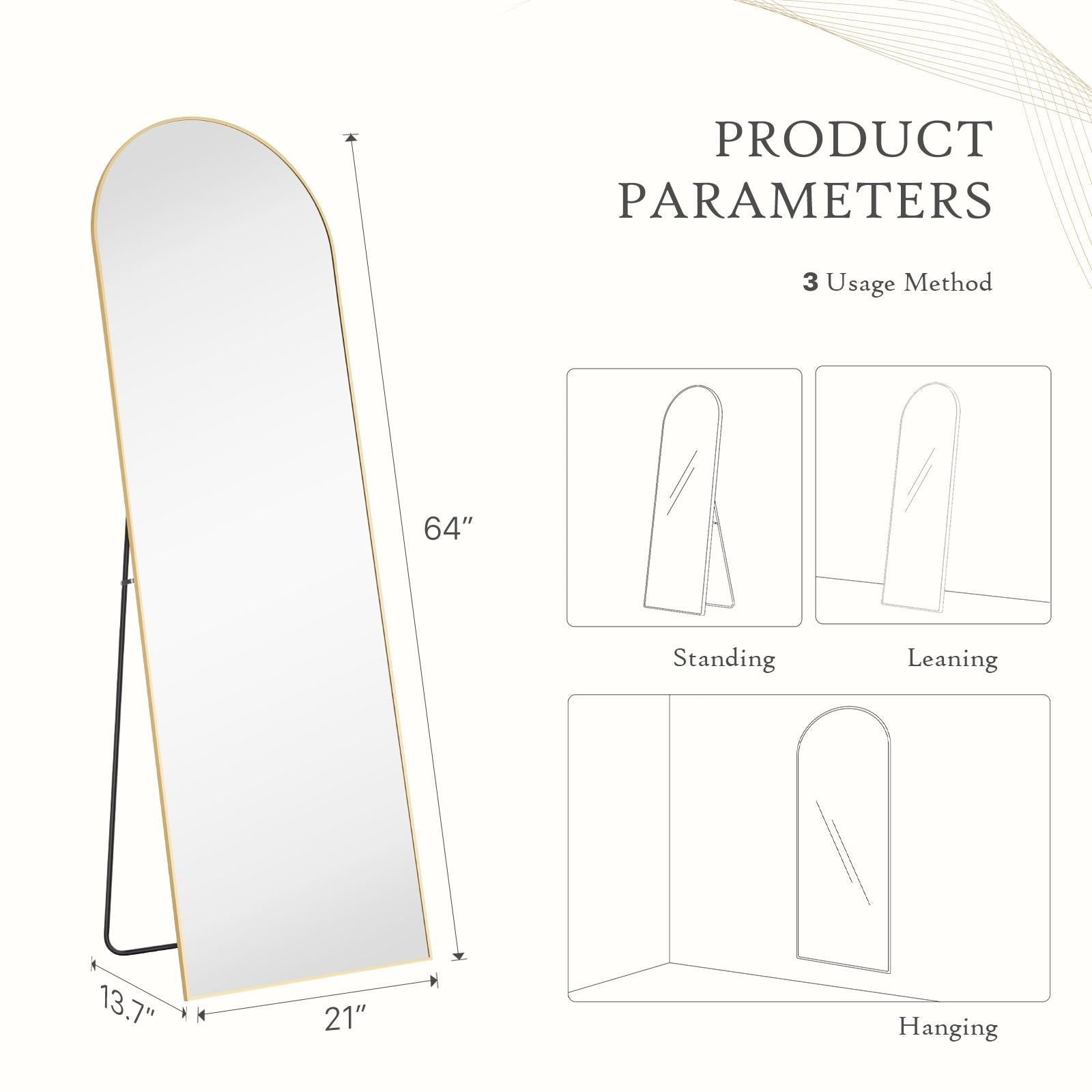 FULL SIZE: The standing mirror is 64" in length and 21" in width, large enough for you to see your entire figure in a single glance. This is not only a body mirror, but also a piece of art in your house which can bring you a nice mood every day.