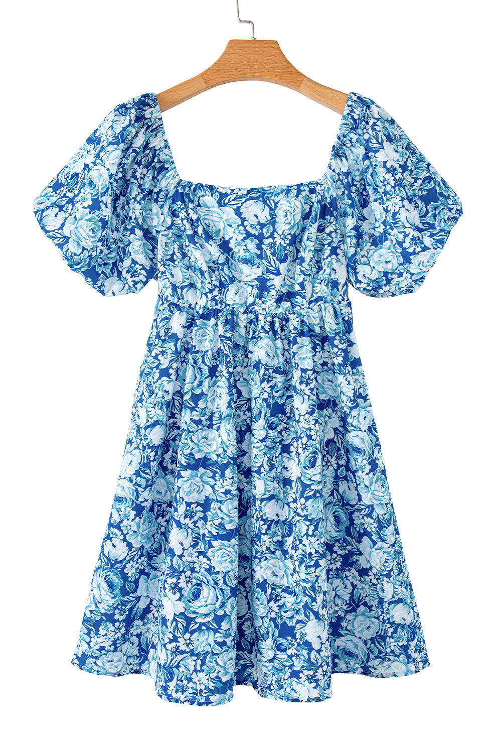 Blue Floral Puff Sleeve Babydoll Mini Dress