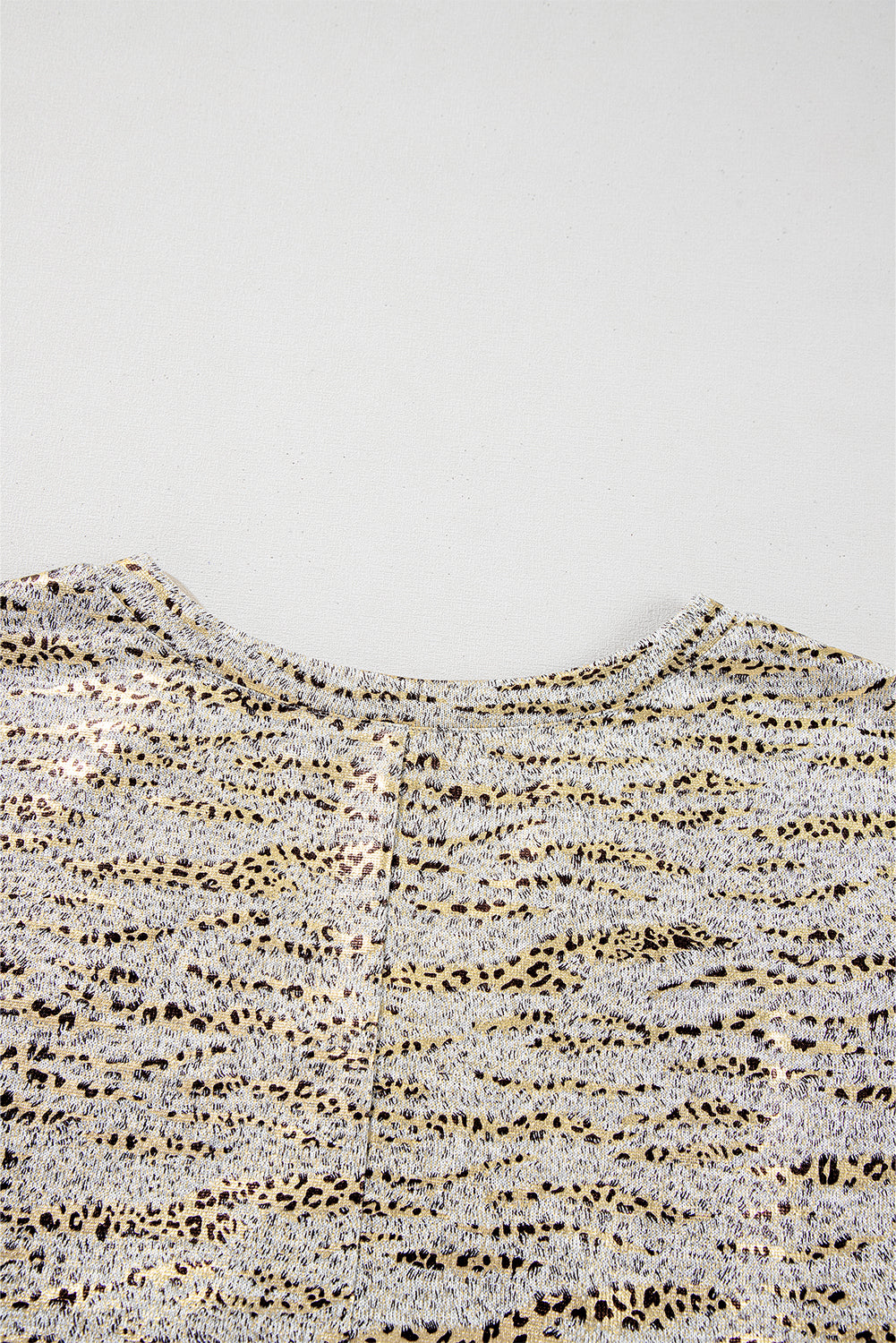 Gray Leopard Print Half Sleeve V Neck Loose Fit T Shirt
