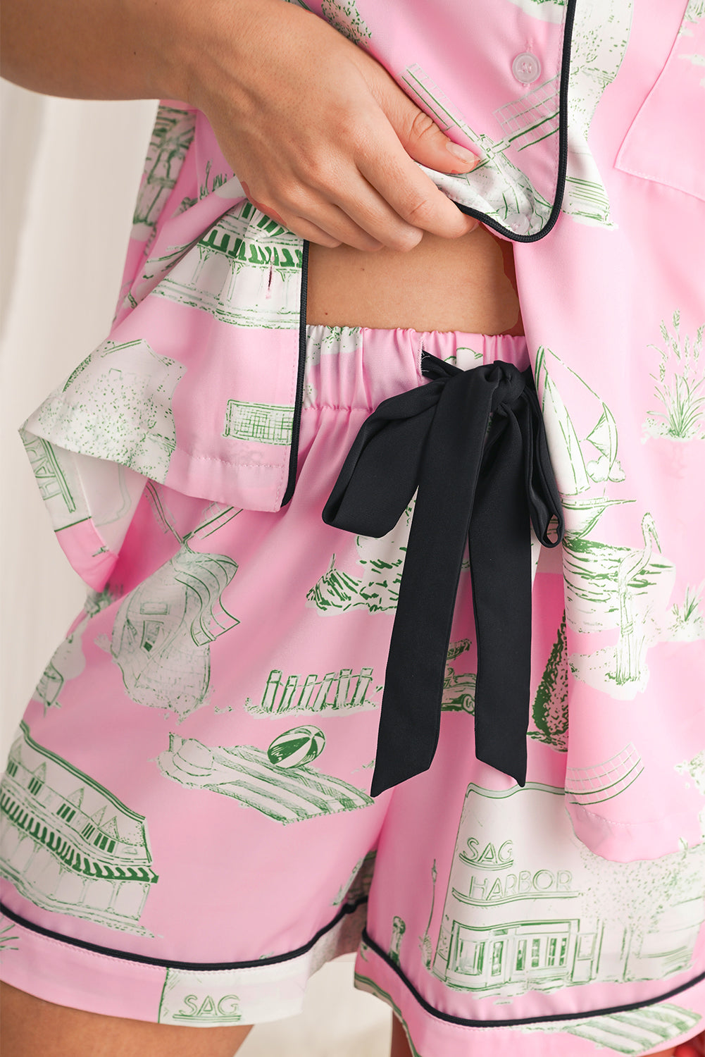 Pink Piping Detail Drawstring Shorts Pajama Set