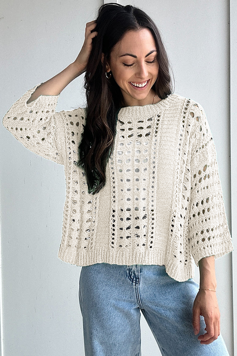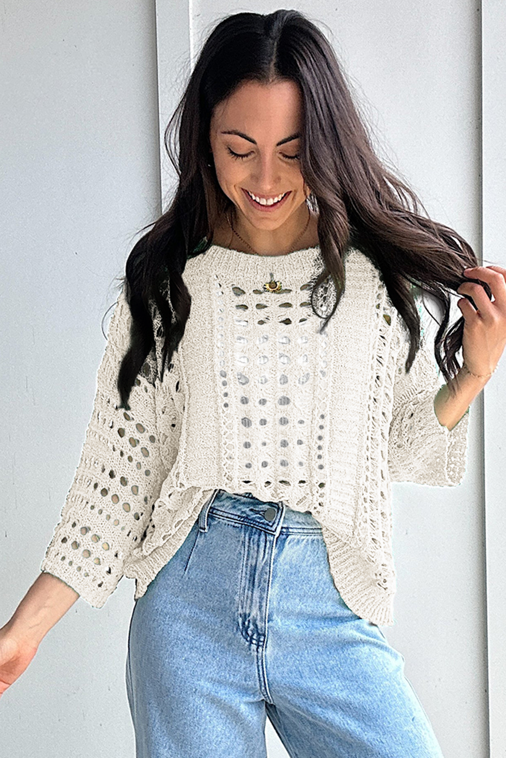 • This White Hollow Out Knit Sweater is a versatile piece blending comfort and style effortlessly.