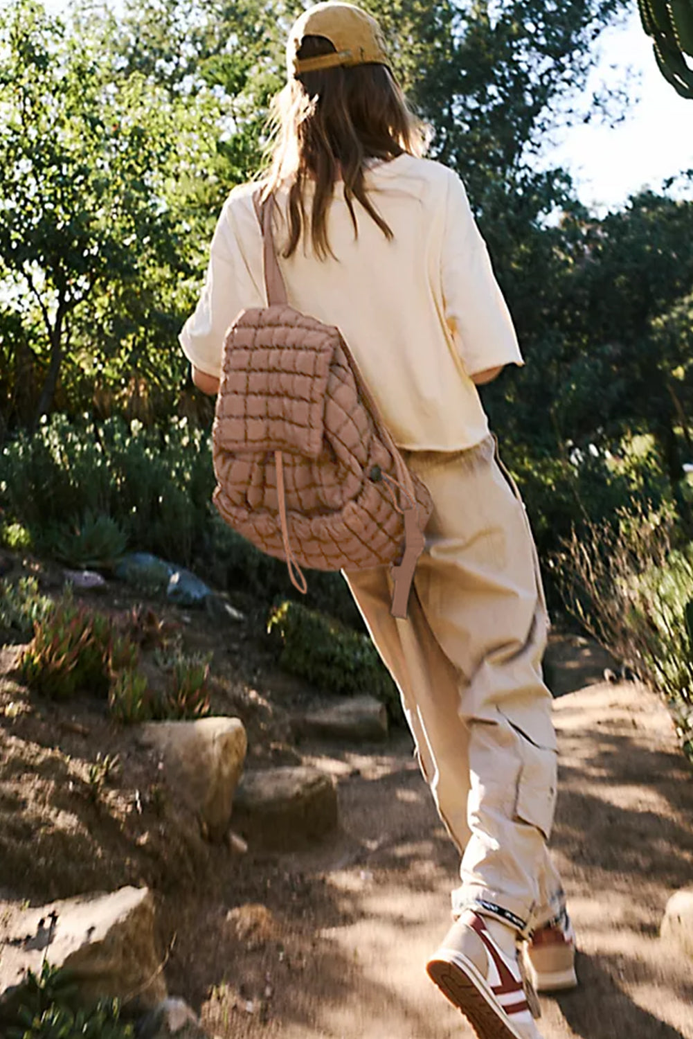 - Quilted puffer material adds texture and style.